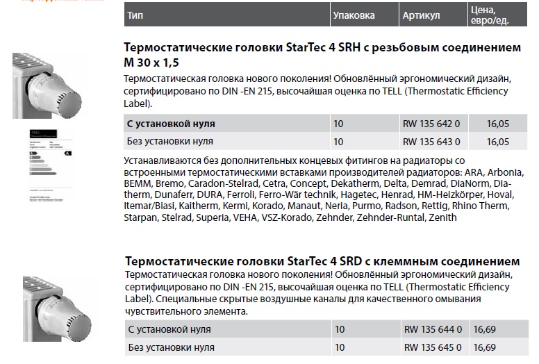 Термостатические головки StarTec 4 SRH с резьбовым соединением M 30 x 1,5